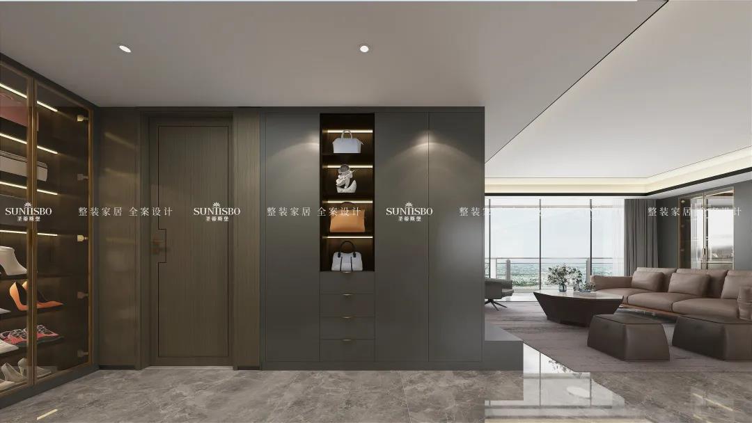 入户采用的是烟熏色,搭配金属把手,配合透明的鞋柜,整个空间看起来简约时尚大气,男主人表示这就是他想象中的样子。