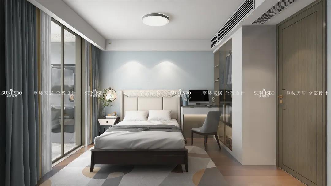 主卧的床是意式轻奢时尚与东方雅韵极致融合,没有半点突兀和乖张。,意大利最出名的便是它的工艺与设计,时尚的莫兰迪色系、轻奢金属的运用,体现娴熟的意式家具设计底蕴,两者之间融合的相得益彰。